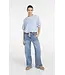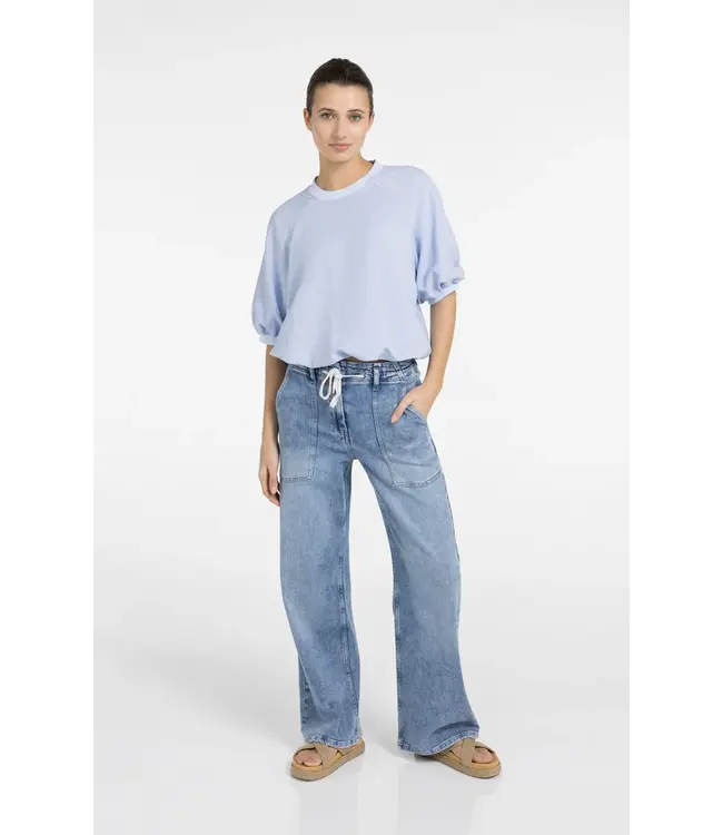 This elegant woven T-shirt features a round neckline and short balloon sleeves finished with a soft cuff. The loose fit and slightly cropped length create a modern, feminine silhouette. A subtle zip closure at the back adds a refined detail. A versatile piece that transitions from casual to chic styling. The model is 175 cm and wears size 36.
